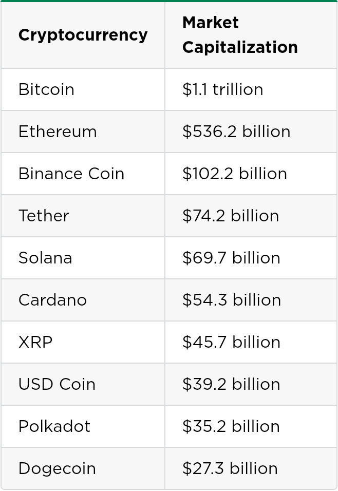 Nearly 15,000 different cryptocurrencies are traded publicly, according to CoinMarketCap.com, a market research website. And cryptocurrencies continue to proliferate. The total value of all cryptocurrencies on Dec. 3 2021, was about 2.6 trillion, having fallen off an all-time high above $2.9 trillion weeks earlier. The total value of all bitcoins, the most popular digital currency, was pegged at about $1.1 trillion.